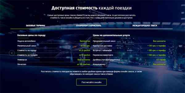 Вже не перший рік на ринку таксомоторних перевезень столиці працює служба «Київ таксі». Багаторічна історія компанії дала можливість запропонувати мешканцям та гостям Києва один з найбільших автопарків, яким забезпечується найбільш швидка подача. Також важливо було запропонувати доступну вартість поїздки, але зберігши високі стандарти обслуговування. Адже для нас важливо щоб кожна ваша поїздка була недорогий і комфортною.